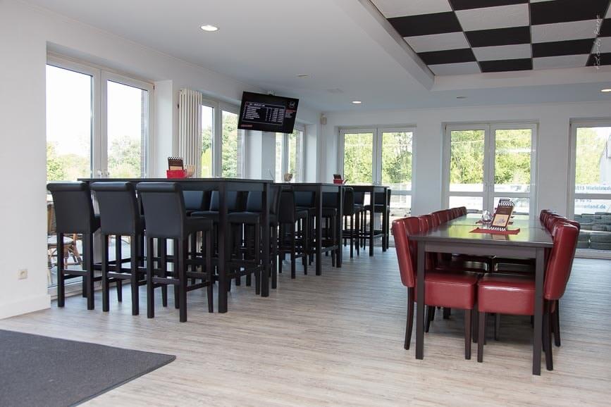 Bei guten Wetter ist zusätzlich die Außenterrasse geöffnet und lädt zum Verweilen ein. Von dort kann das Renngeschehen auf der Outdoorbahn beobachtet werden.